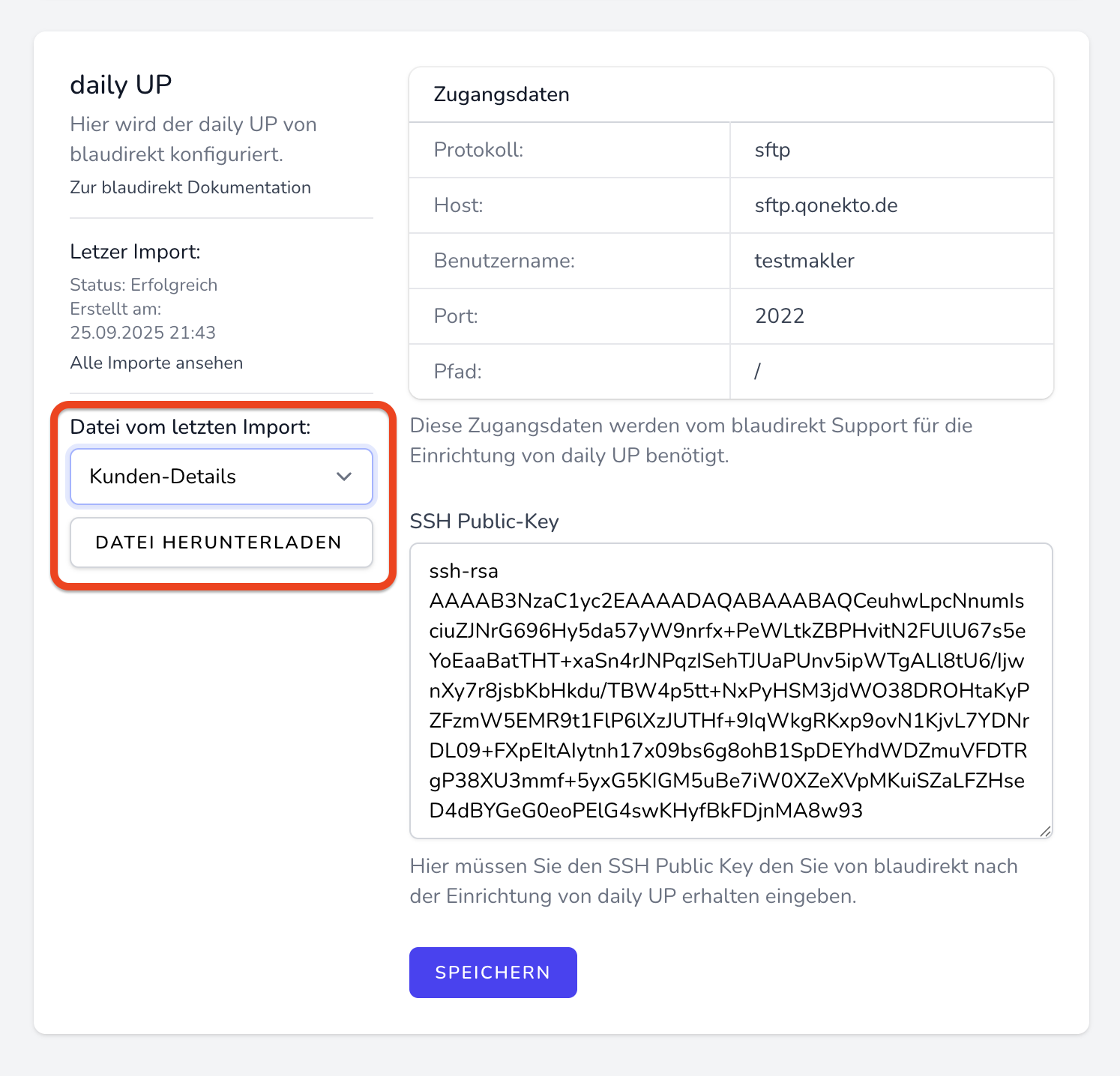Mit dem DailyUP-Service von blau erhältst du einmal täglich strukturierte CSV-Dateien, die Dir über unser Qonekto Backend bereitgestellt und über die