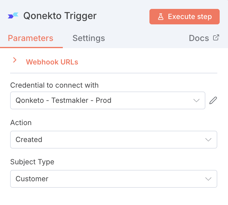n8n ergänzt automatisch die benötigten Webhook URLs. Sobald der Node aktiviert ist, wird der Workflow immer dann ausgeführt, wenn Qonekto das definierte Ereignis meldet.
